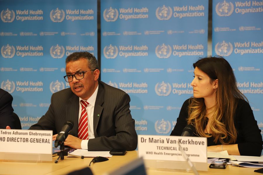 World Health Organization (WHO) Director-General Tedros Adhanom Ghebreyesus (L) speaks at a press conference in Geneva, Switzerland, on March 11, 2020.(Xinhua/Chen Junxia)