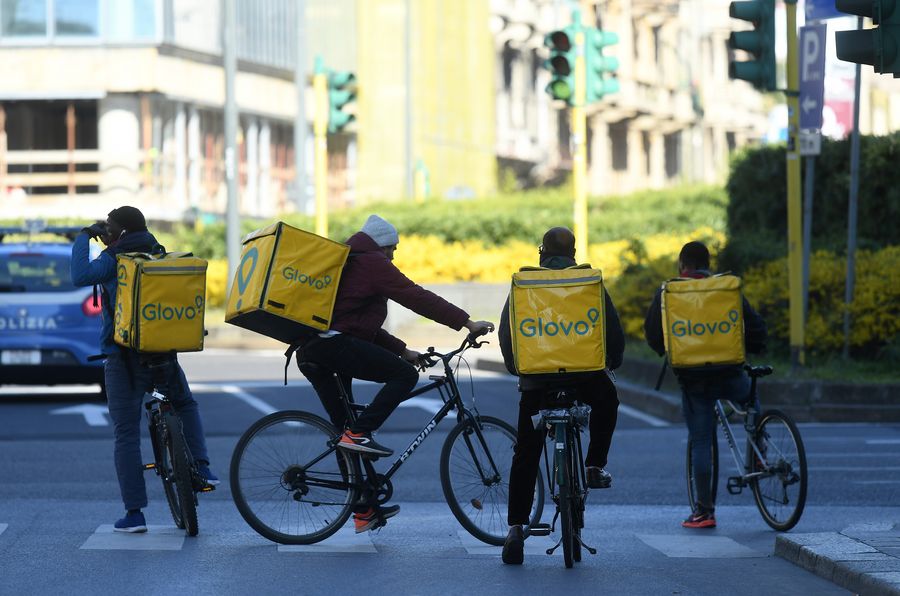 Food-delivers work in Milan, Italy, on March 11, 2020.(Photo by Daniele Mascolo/Xinhua)