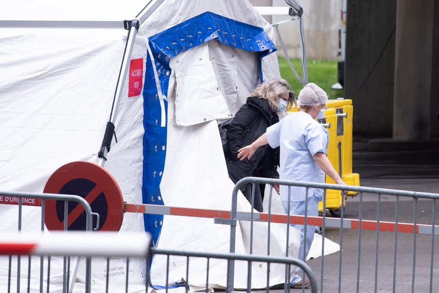 A nurse escorts a woman out of a tent to treat suspected COVID-19 cases in the courtyard of Henri Mondor Hospital in Creteil, France, March 10, 2020.(Photo provided by Jack Chan/Xinhua)