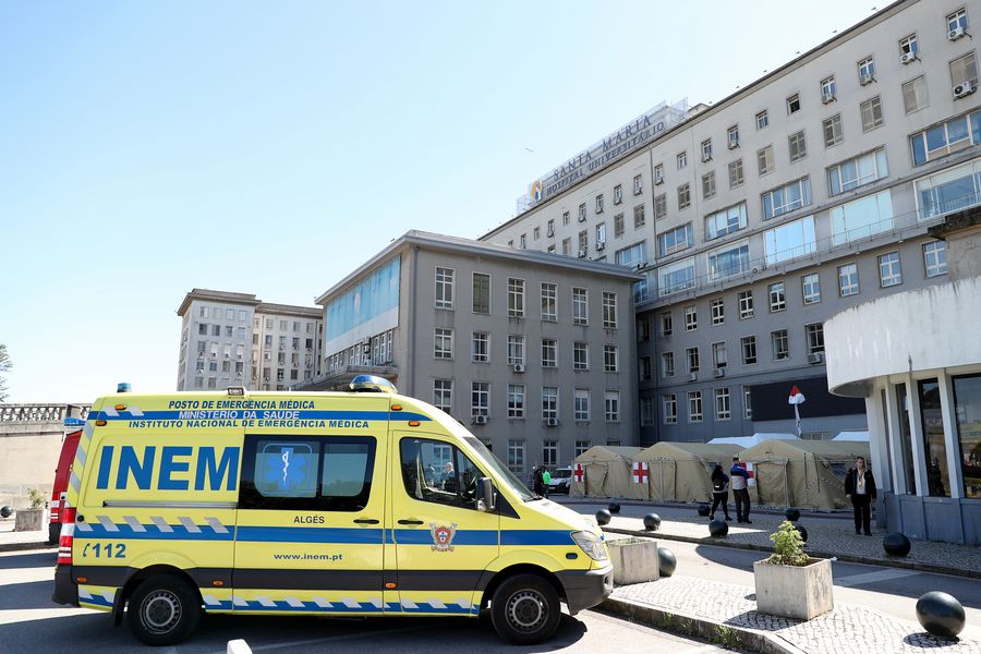 An ambulance and tents provided by the Portuguese Red Cross to quarantine suspected COVID-19 cases are seen next to Santa Maria Hospital in Lisbon, Portugal, on March 10, 2020.(Photo by Pedro Fiuza/Xinhua)
