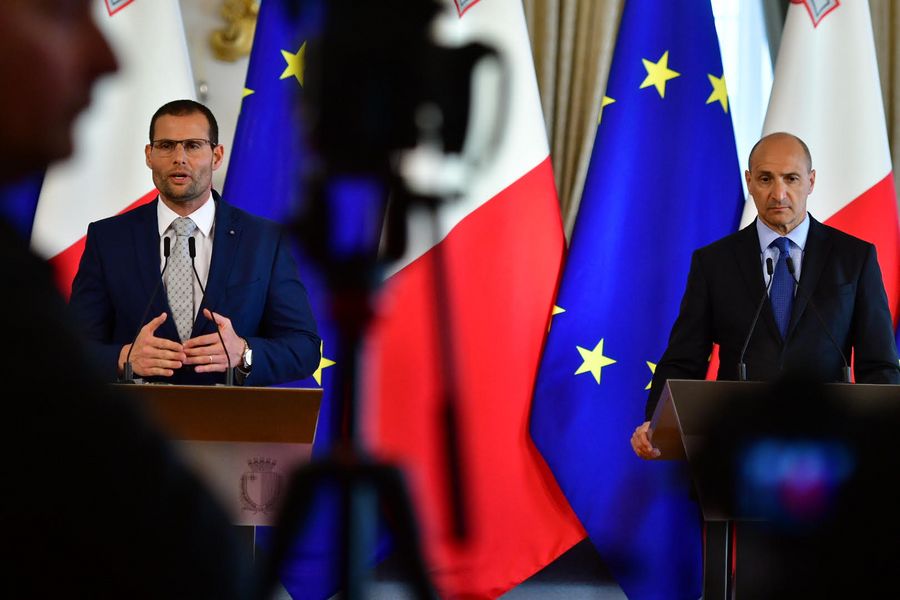 Malta's Prime Minister Robert Abela (L) addresses a press conference about the COVID-19 in Valletta, Malta, on March 11, 2020.(Photo by Jonathan Borg/Xinhua)