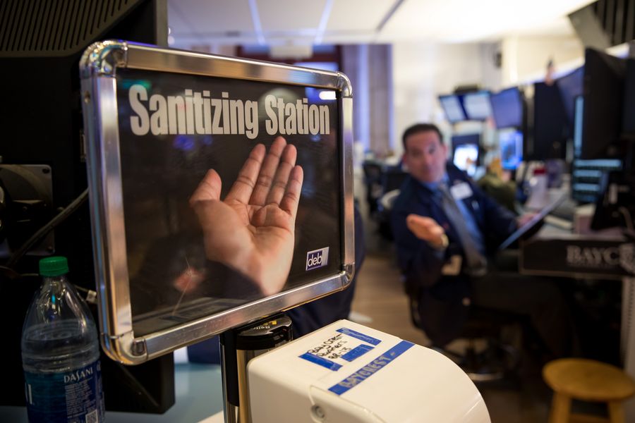 A trader works beside a sanitizing station at the New York Stock Exchange (NYSE) in New York, the United States, March 11, 2020. (Photo by Michael Nagle/Xinhua)