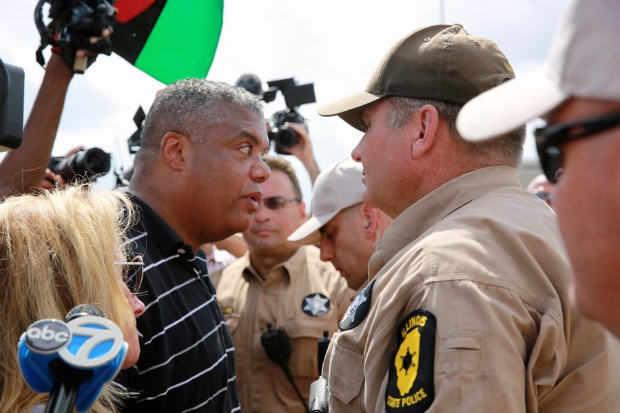 A protester confronts Illinois State Police in Chicago, the United States, on Sept. 3, 2018. (Xinhua/Wang Ping)
