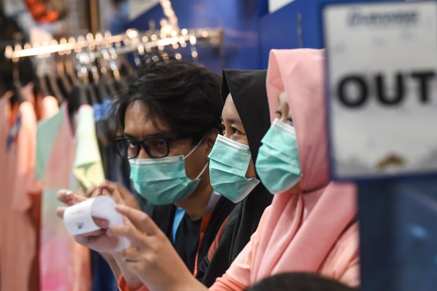 People wear masks during Indonesia Outdoor Festival (Indofest) 2020 in Jakarta, Indonesia, March 12, 2020. (Xinhua/Agung Kuncahya B.)