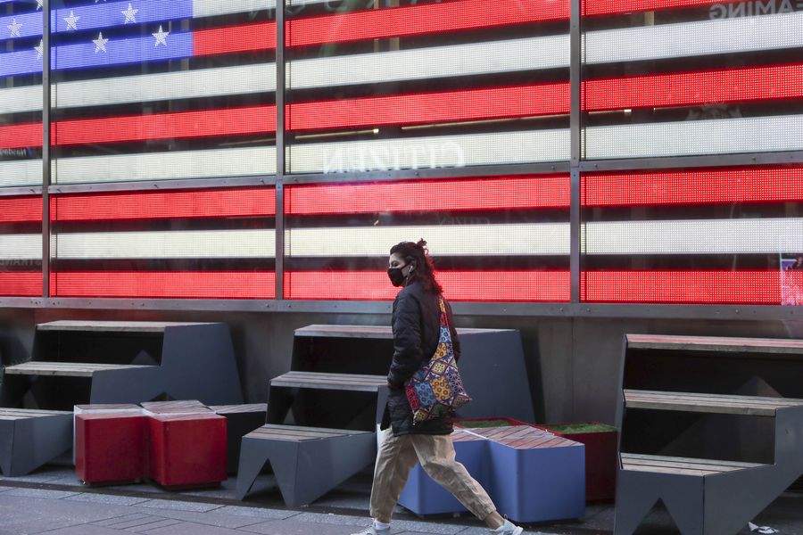 A woman with a face mask walks in Times Square in Manhattan of New York, the United States, March 4, 2020. (Xinhua/Wang Ying)