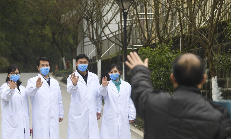 A recovered patient waves to bid farewell to the medical staff at the Chongqing Public Health Center in southwest China's Chongqing, March 15, 2020. The last patient diagnosed with the novel coronavirus disease (COVID-19) has been cured and discharged from the center, bringing the number of COVID-19 patients being treated in hospitals to zero in Chongqing. (Xinhua/Wang Quanchao)
