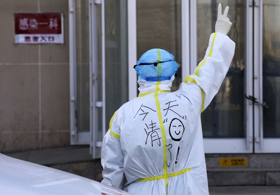 A medical worker gestures for victory at Tianjin Haihe Hospital in north China's Tianjin Municipality, March 15, 2020. The last COVID-19 patient in Tianjin was cured and discharged from the hospital on Sunday. (Xinhua/Deng Haoran)