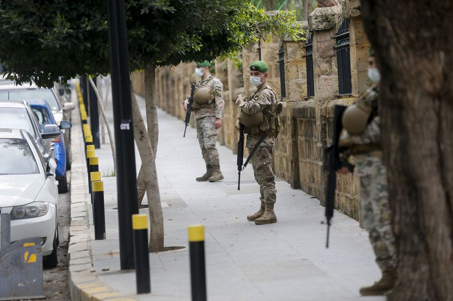 Military personnel wearing masks stand guard in Beirut, Lebanon, March 15, 2020. Lebanon's Higher Defense Council announced on Sunday a state of health emergency in the country amid COVID-19 outbreak, calling on security agencies to stay alert, TV channel MTV reported. (Photo by Bilal Jawich/Xinhua)