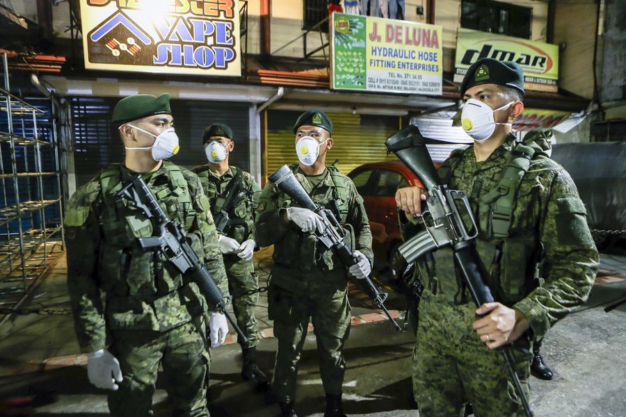 Soldiers from the Armed Forces of the Philippines (AFP) wearing face masks are seen at a checkpoint during the Metro Manila "community quarantine" in Valenzuela City, the Philippines on March 15, 2020. A curfew is imposed in Metro Manila, as part of the "community quarantine" from March 15 until April 14, in a bid to contain the spread of COVID-19. (Xinhua/Rouelle Umali)