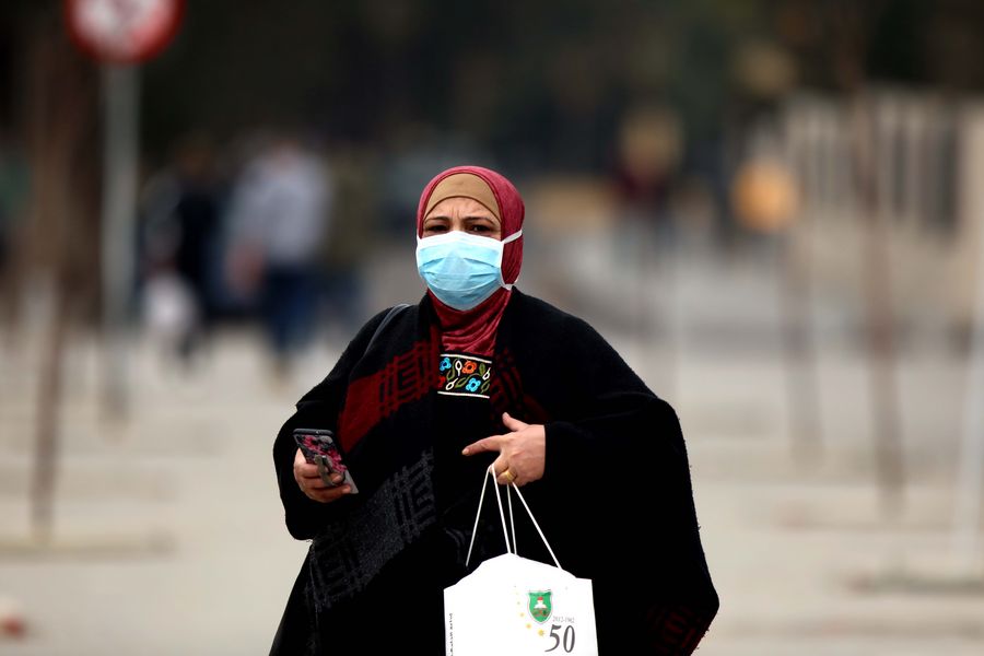 A woman wearing a mask walks on a street in Amman, Jordan, on March 15, 2020. Jordan on Sunday confirmed six cases of COVID-19 for two Jordanian nationals and four French tourists, bringing the total number of confirmed cases to seven. (Photo by Mohammad Abu Ghosh/Xinhua)