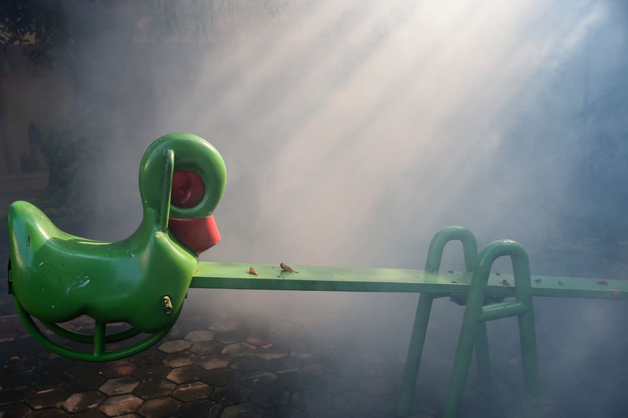 Photo taken on March 15, 2020 shows a seesaw shrouded by anti-mosquito fog on the playground of Pangudi Luhur School Foundation in Jakarta, Indonesia. (Xinhua/Agung Kuncahya B.)