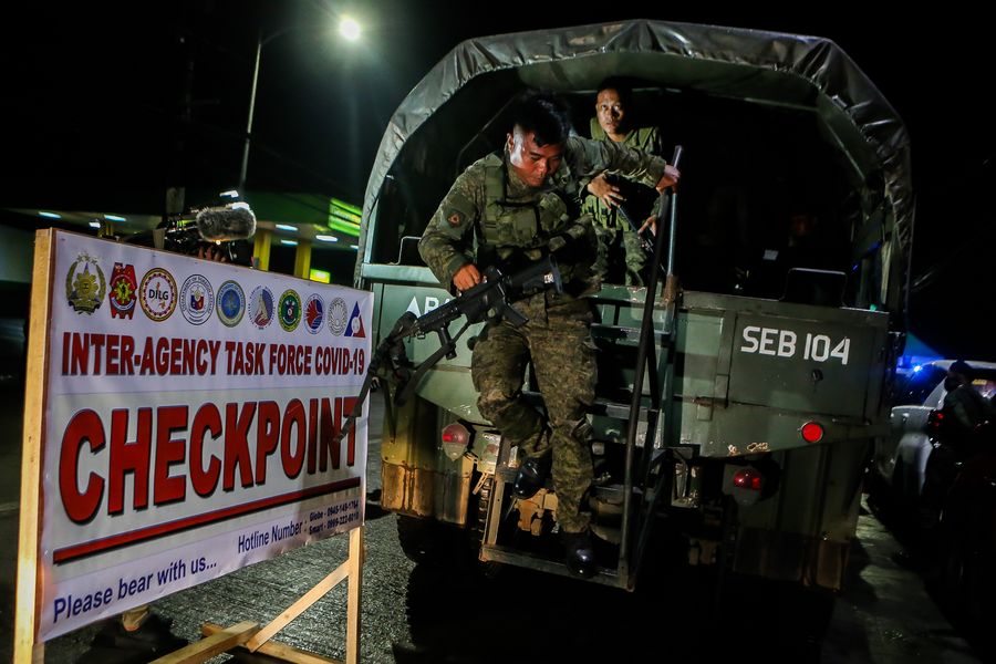 Soldiers from the Armed Forces of the Philippines (AFP) alight from a military truck during the Metro Manila "community quarantine" in Valenzuela City, the Philippines on March 15, 2020. (Xinhua/Rouelle Umali)