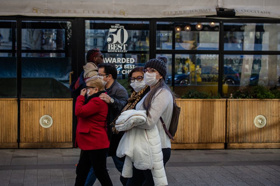 Pedestrians wearing protective masks walk in front of a closed store in Paris, France, March 15, 2020.(Photo by Aurelien Morissard/Xinhua)