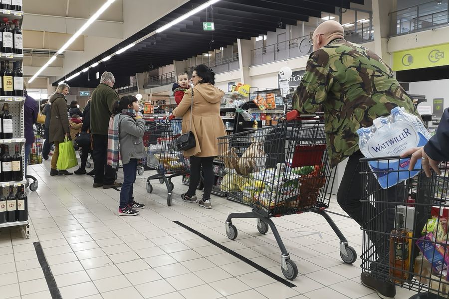 People queue to check out in a supermarket in Lille, France on March 16, 2020.(Photo provided by Sebastien Courdji/Xinhua)