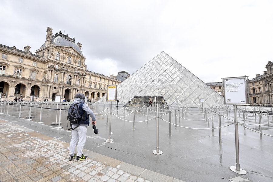 A man stands in front of the closed Louvre Museum in Paris, France, on March 14, 2020.(Photo by Jack Chan/Xinhua)