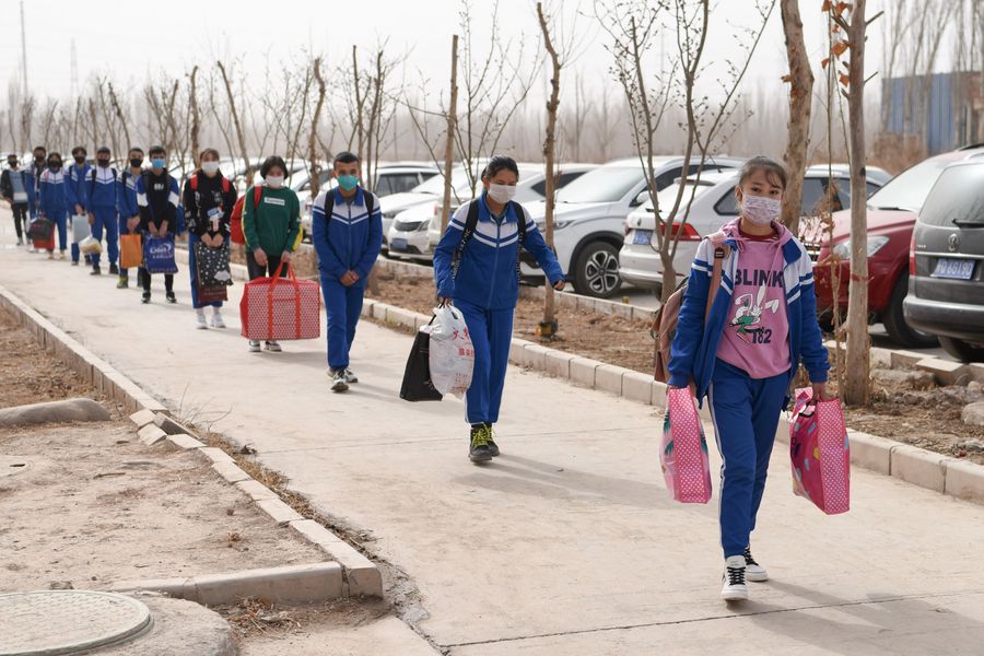 Junior three graders go back to school at the No. 8 Middle School in Kashgar Prefecture, northwest China's Xinjiang Uygur Autonomous Region, March 15, 2020. (Xinhua/Ding Lei)
