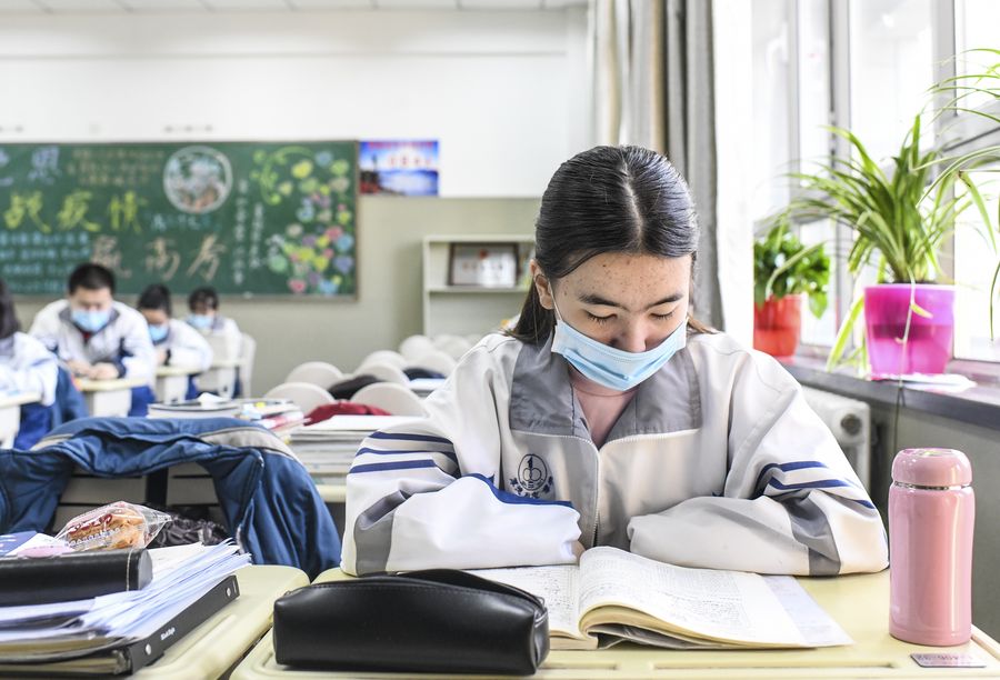 A senior three grader reads her textbook at the Urumqi No.1 Senior High School in Urumqi, northwest China's Xinjiang Uygur Autonomous Region, March 16, 2020. (Xinhua/Wang Fei)