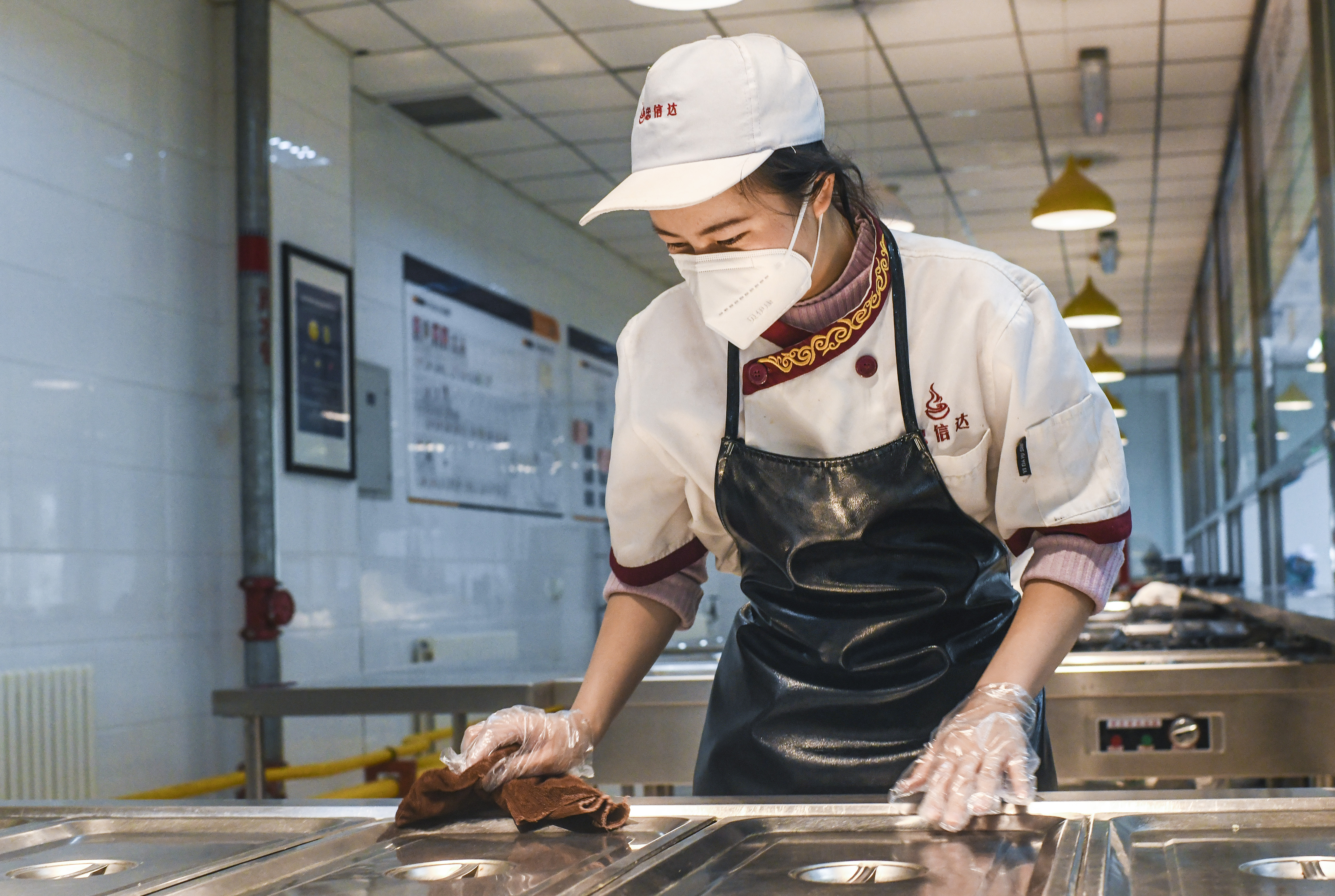 A staff member conducts disinfection at the dining hall of the Urumqi No.1 Senior High School in Urumqi, northwest China's Xinjiang Uygur Autonomous Region, March 15, 2020.(Xinhua/Wang Fei)