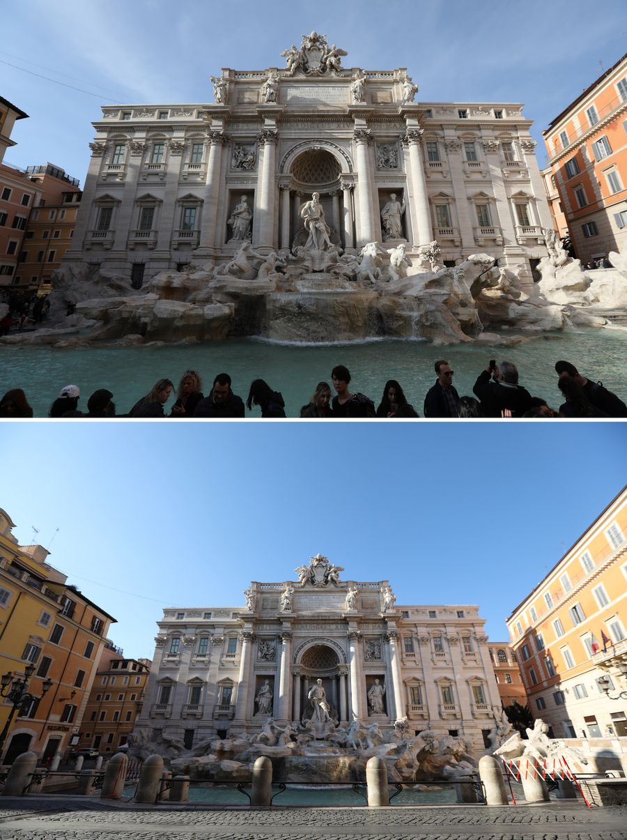 Combo photo shows the Trevi Fountain on March 6, 2020 (top) and on March 16, 2020 in Rome, Italy. (Xinhua/Cheng Tingting)