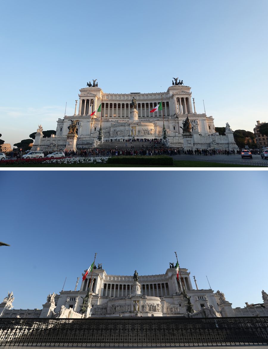 Combo photo shows Piazza Venezia on March 4, 2019 (top) and March 16, 2020 in Rome, Italy. (Xinhua/Cheng Tingting)