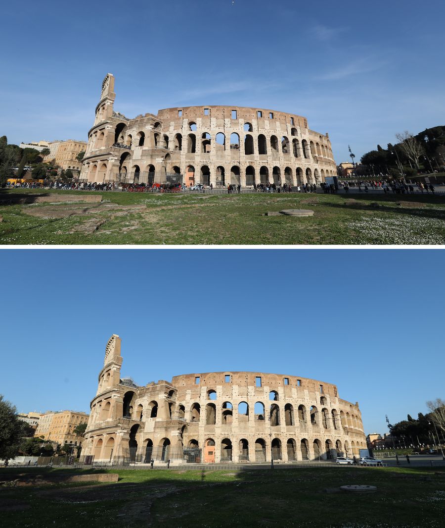 Combo photo shows the Colosseum on March 6, 2019 (top) and March 16, 2020 in Rome, Italy. (Xinhua/Cheng Tingting)