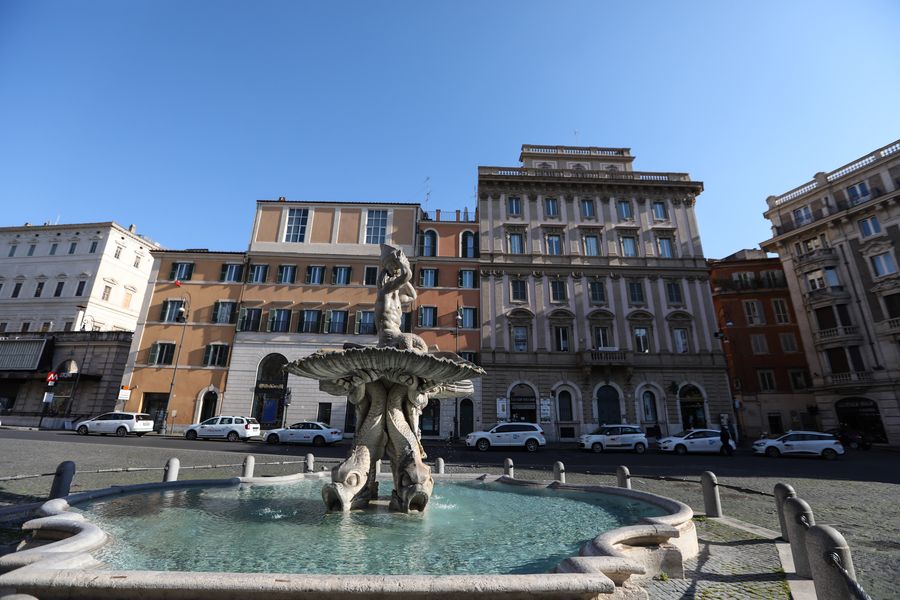 Taxi drivers wait at a taxi stop on Piazza Barberini in Rome, Italy, March 16, 2020. (Xinhua/Cheng Tingting)