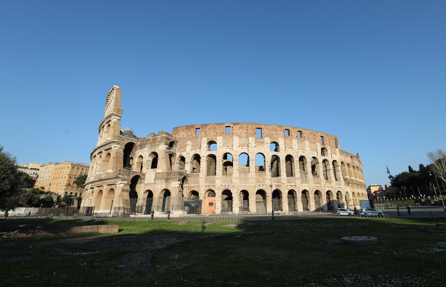 No tourists are seen at the Colosseo in Rome, Italy, March 16, 2020. (Xinhua/Cheng Tingting)
