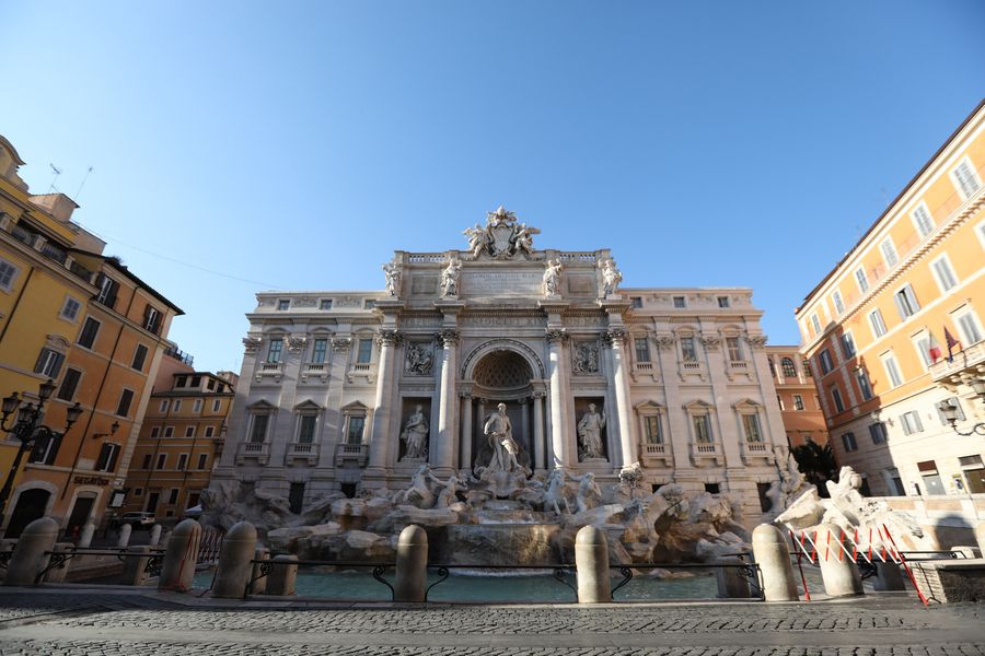 The Trevi Fountain is closed in Rome, Italy, March 16, 2020.(Xinhua/Cheng Tingting)