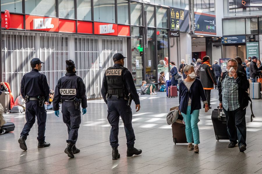 People wearing masks are seen at the Montparnasse train station in Paris, France, March 19, 2020. (Photo by Aurelien Morissard/Xinhua)