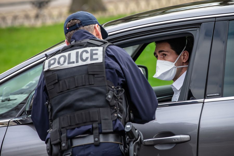 A policeman checks a car on the Champs-Elysees Avenue in Paris, France, March 17, 2020. (Photo by Aurelien Morissard/Xinhua)