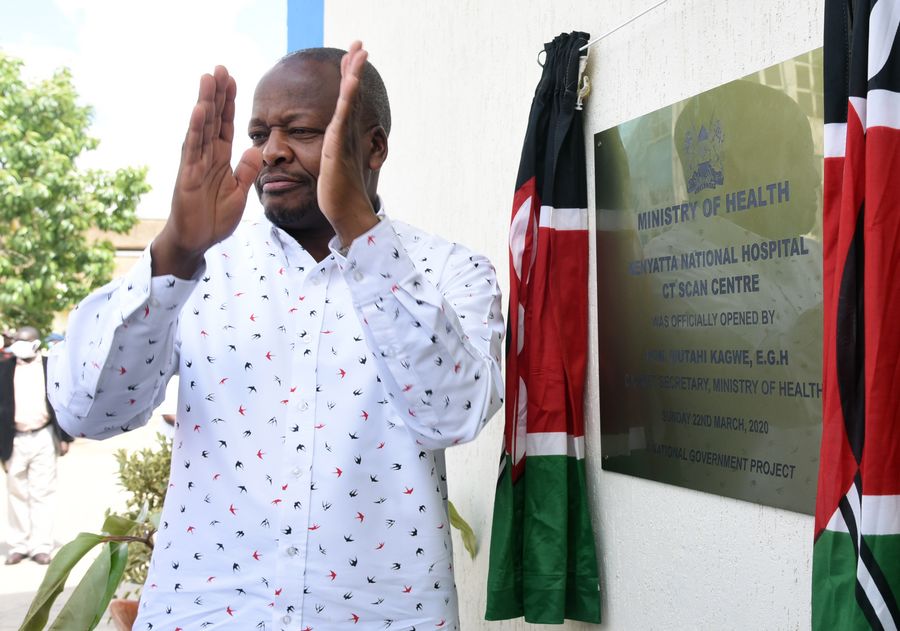 Kenyan Health Cabinet Secretary Mutahi Kagwe applauds after launching the Kenyatta National Hospital Diagnostic and Reporting Center in Nairobi, capital of Kenya, March 22, 2020. (Xinhua/John Okoyo)