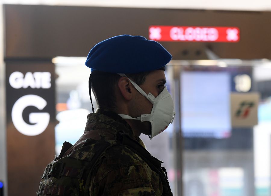 An Italian soldier is on duty at Roma Termini railway station in Rome, Italy, on March 23, 2020. (Photo by Augusto Casasoli/Xinhua)