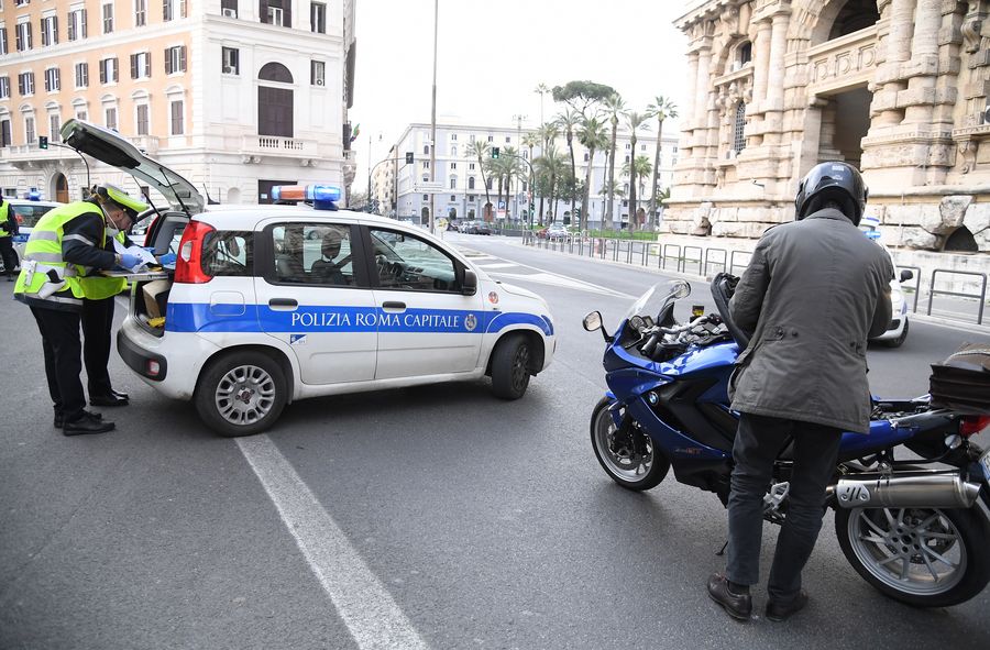 Policemen check a motorcyclist in Rome, Italy, March 22, 2020. (Photo by Elisa Lingria/Xinhua)