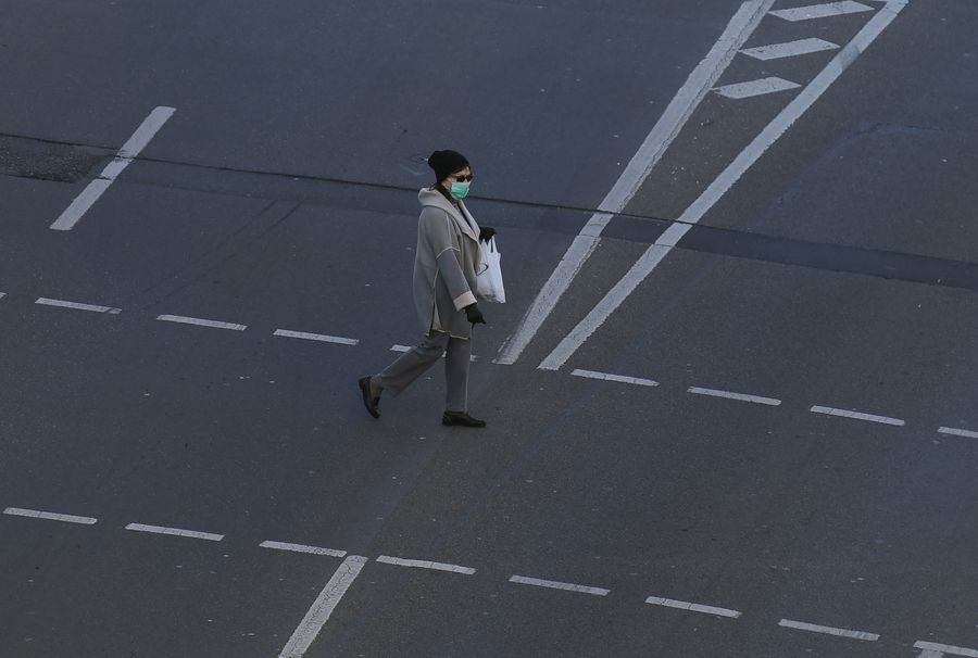 A woman wearing a face mask walks on a street in Frankfurt, Germany, March 25, 2020.(Xinhua/Lu Yang)