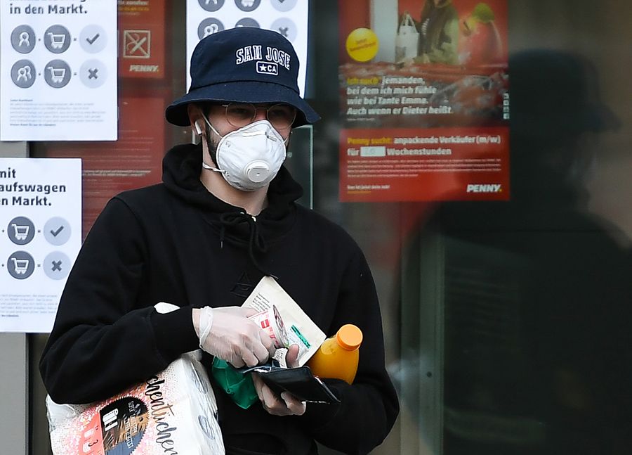 A man wearing a face mask and gloves leaves a supermarket in Frankfurt, Germany, March 25, 2020.(Xinhua/Lu Yang)