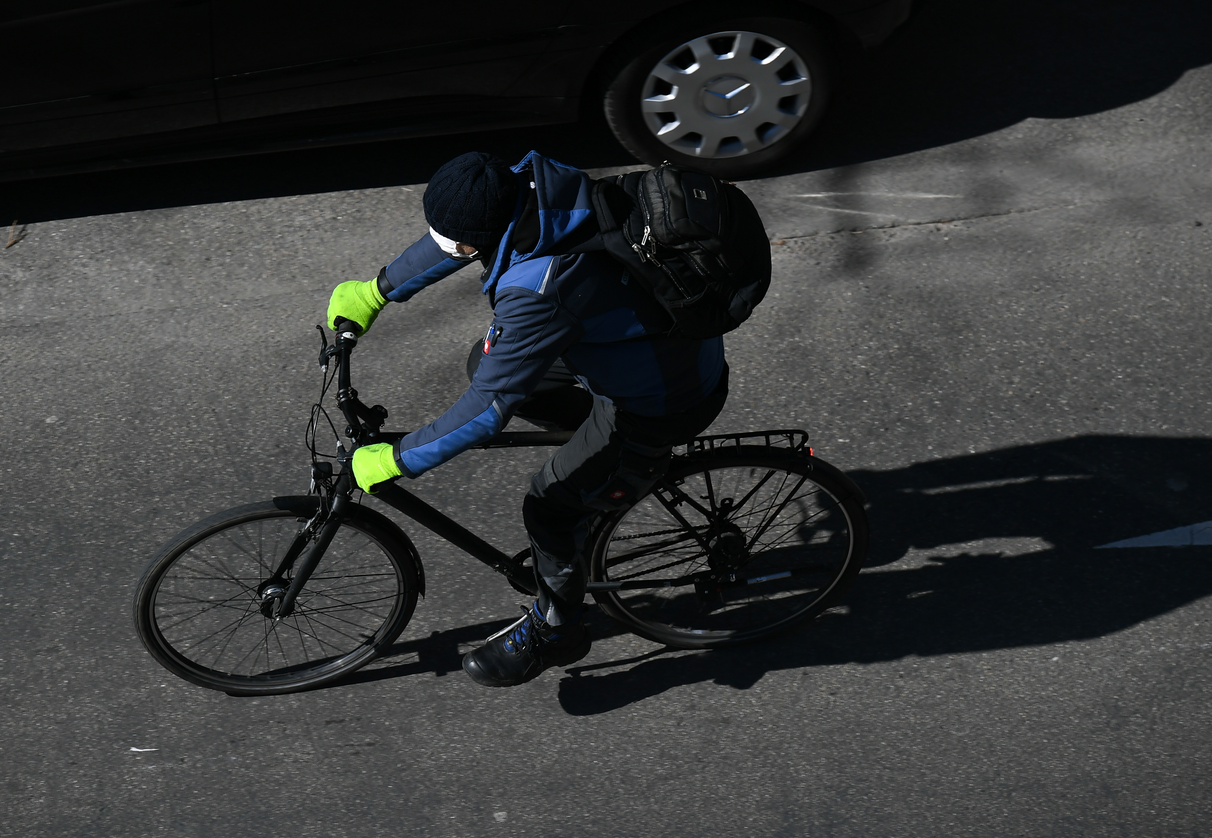 A man with a facial mask rides a bicycle on a street in Frankfurt, Germany, March 24, 2020.(Xinhua/Lu Yang)