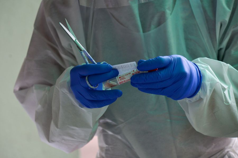 A medical staff member works at a COVID-19 testing area of a hospital in Damansara near Kuala Lumpur, Malaysia, March 30, 2020. (Photo by Chong Voon Chung/Xinhua)