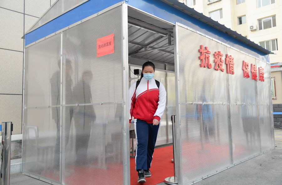 A graduating student gets temperature checked at the entrance of the school building of Hohhot No. 35 Middle School in Hohhot, north China's Inner Mongolia Autonomous Region, March 30, 2020.(Xinhua/Lian Zhen)