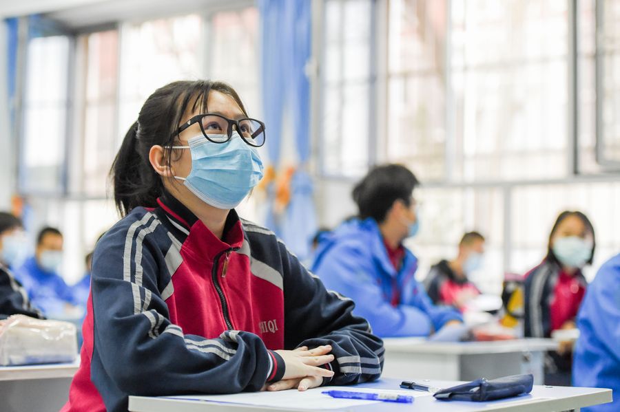Graduating students attend a class at Hohhot No. 35 Middle School in Hohhot, north China's Inner Mongolia Autonomous Region, March 30, 2020.(Xinhua/Lian Zhen)