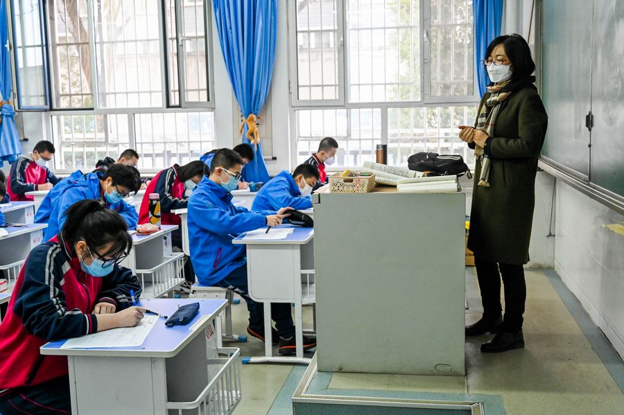 Graduating students attend a class at Hohhot No. 35 Middle School in Hohhot, north China's Inner Mongolia Autonomous Region, March 30, 2020. (Xinhua/Lian Zhen)