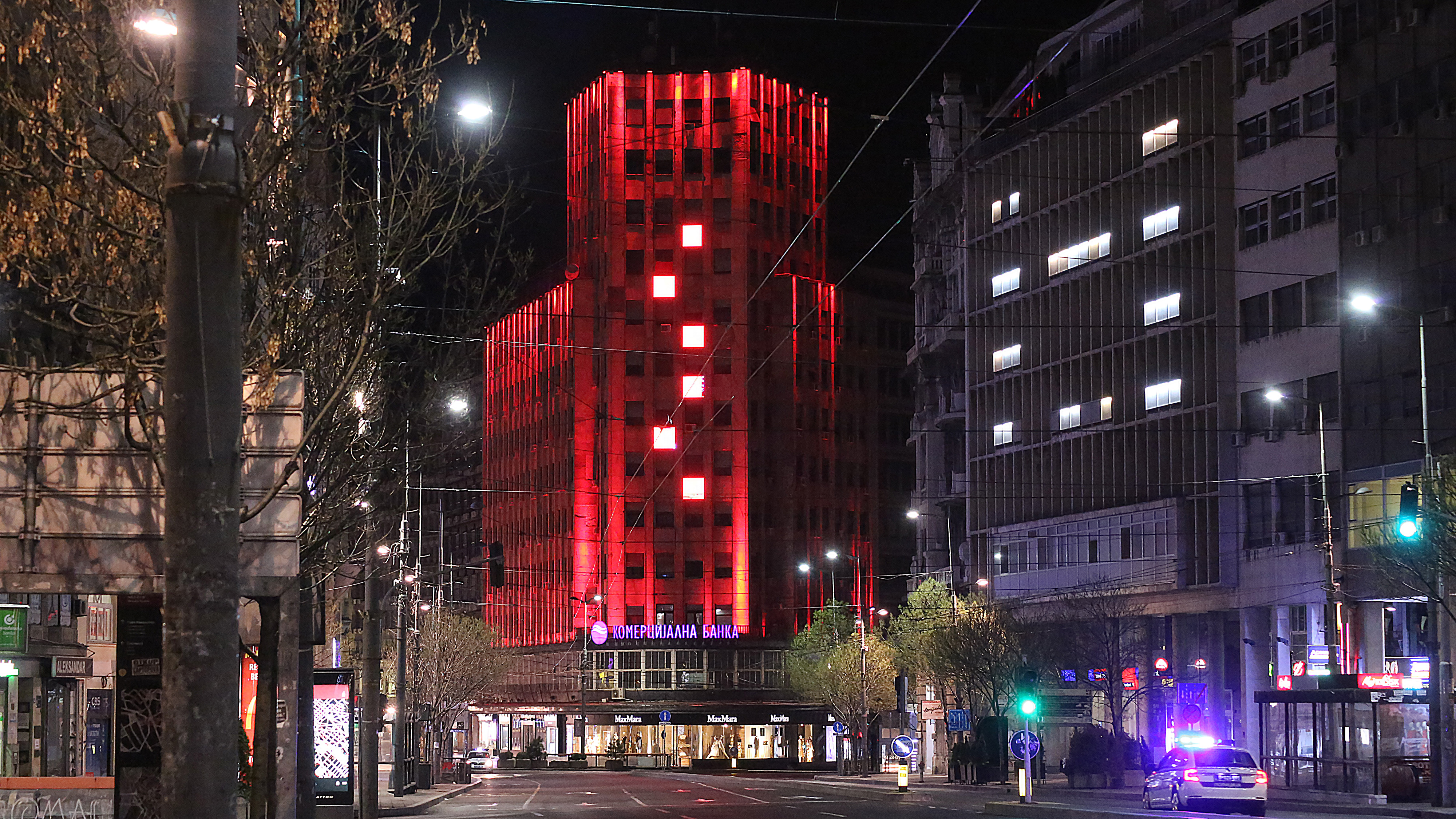 A building is illuminated in red in downtown Belgrade, Serbia, March 22, 2020. (Photo by Nemanja Cabric/Xinhua)