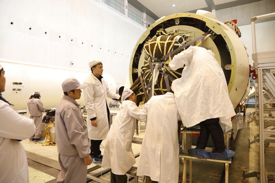 Chinese space engineers install parachutes and control devices on a booster of Long March-3B carrier rocket. (Photo provided by CALT)