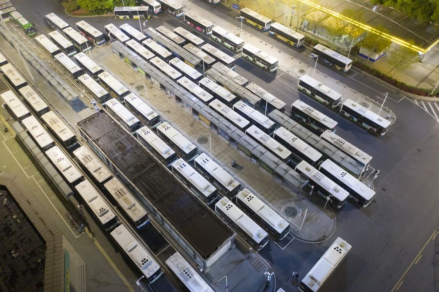 Aerial photo taken on March 25, 2020 shows buses waiting at the terminus at Hankou Railway Station in Wuhan, central China's Hubei Province. (Xinhua/Cai Yang)