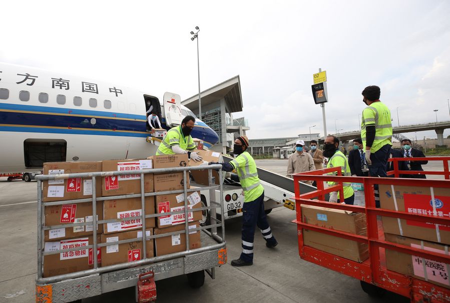 Workers unload the medical materials arrived with the Chinese medical expert team at the Islamabad International Airport in Islamabad, capital of Pakistan, March 28, 2020. (Xinhua/Liu Tian)