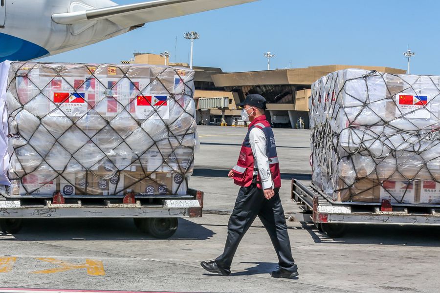 A member of the Chinese medical expert team walks in front of cargos of Chinese medical supplies at Ninoy Aquino International Airport in Paranaque City, the Philippines, April 5, 2020. (Xinhua/Rouelle Umali)