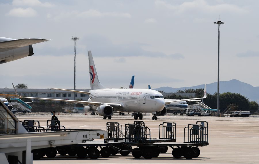Flight MU2527 of China Eastern airlines lands at the Phoenix International Airport in Sanya, south China's Hainan Province, April 8, 2020. Flight MU2527 was the first flying from Wuhan, capital of central China's Hubei Province, after it lifted outbound travel restrictions on Wednesday following almost 11 weeks of lockdown to stem the spread of COVID-19. (Xinhua/Yang Guanyu)