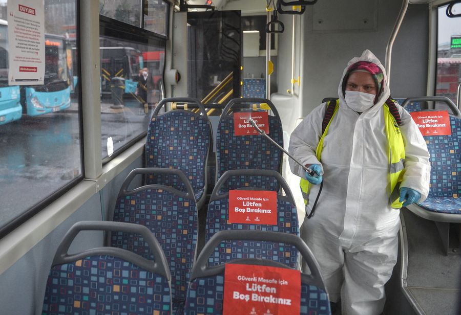 A staff member disinfects a bus in Istanbul, Turkey, April 4, 2020. (Xinhua)