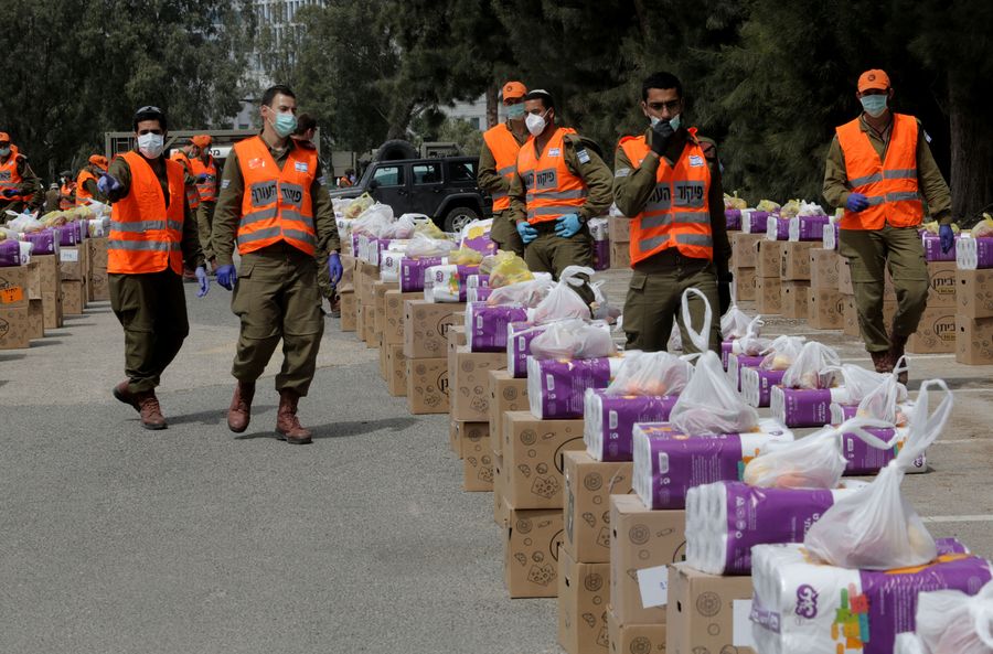 Israeli soldiers prepare to collect and pack for distributing food packages to local citizens in the central Israeli city of Bnei Brak, on April 6, 2020. (Xinhua/Gil Cohen Magen)