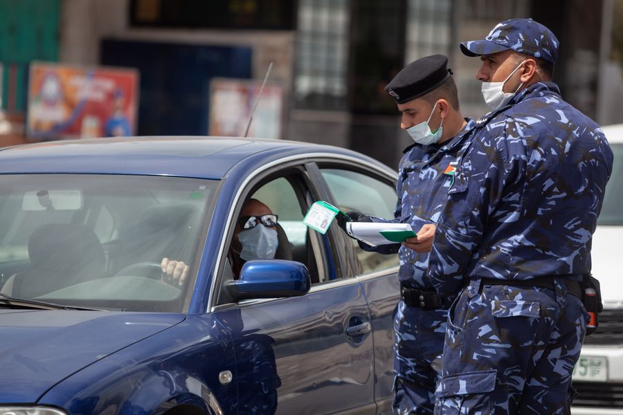 A Palestinian police officer questions a driver during a campaign to seize drivers who violate the emergency law in the West Bank city of Bethlehem, on April 6, 2020. (Xinhua/Luay Sababa)