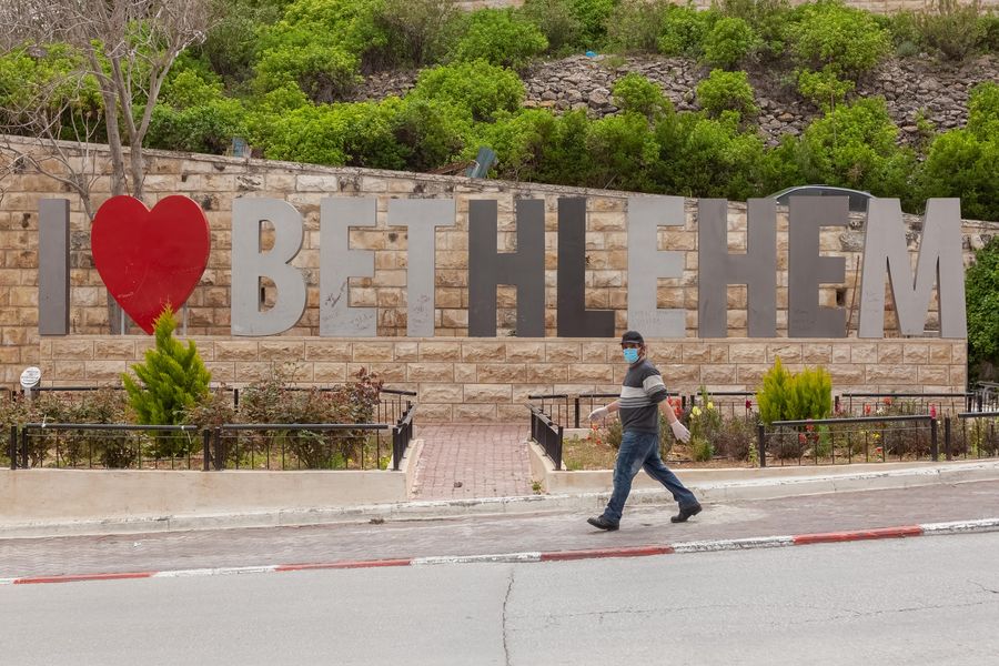 A Palestinian man wearing face mask walks past the iconic sign I Love Bethlehem, in the West Bank city of Bethlehem, on April 5, 2020. (Xinhua/Luay Sababa)
